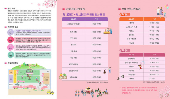 À̹ø Çà»ç´Â Àü½Ã¡¤Ã¼Ç衤°ø¿¬¡¤Æ¯°ÀÇ ´Ùä·Î¿î Àι®ÇÐ ÇÁ·Î±×·¥À¸·Î ±¸¼ºµÅ º¢²ÉÁÖ°£(4¿ù 2~10ÀÏ, ¿ÀÈÄ 10½Ã±îÁö ¿¬Àå °³°ü)¿¡ ¸ÂÃß¾î Ãæ³²¿ª»ç¹Ú¹°°üÀ» ã´Â °ü¶÷°´¿¡°Ô »ö´Ù¸¥ Ãß¾ïÀ» ¼±»çÇÒ °ÍÀ¸·Î ±â´ëµÈ´Ù.