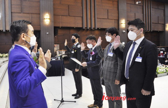 | | ¡è¡è À̼®ÀÏ È¸ÀåÀ» ºñ·ÔÇÑ ÀÓ¿øÁøµéÀÌ ÀÔȸ ¼±¼¸¦ Çϰí ÀÖ´Ù. | ¨Ï ¿Â¾ç½Å¹® | |