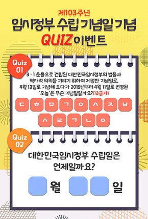 ÀÓ½ÃÁ¤ºÎ ¼ö¸³±â³äÀÏ ±â³ä ÄûÁîÀ̺¥Æ®´Â Ãæ³²¼ºÎº¸ÈÆÁöû ÆäÀ̽ººÏ ÆäÀÌÁö¸¦ ÅëÇØ ´©±¸³ª Âü¿© °¡´ÉÇϸç Á¦103ÁÖ³â ÀÓ½ÃÁ¤ºÎ¼ö¸³±â³äÀÏÀ» ±â³äÇÏ°í ´ëÇѹα¹ÀÓ½ÃÁ¤ºÎÀÇ ¿ª»çÀû ÀÇÀÇ¿Í µ¶¸³À¯°øÀÚµéÀÇ Èñ»ý°ú Çå½ÅÀ» ³Î¸® ¾Ë¸®±â À§ÇØ ±âȹµÆ´Ù.