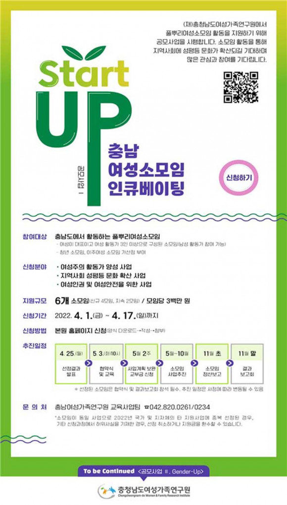 ÃæÃ»³²µµ¿©¼º°¡Á·¿¬±¸¿ø(¿øÀå Á¶¾ç¼ø)Àº µµ³» Ç®»Ñ¸®¿©¼º¼Ò¸ðÀÓÀ» Ȱ¼ºÈÇϰí Áö¿ª»çȸ ¼ºÆòµî ¹®È¸¦ È®»êÇϱâ À§ÇÑ ¸ñÀûÀ¸·Î ¡®2022³â Ãæ³²¿©¼º¼Ò¸ðÀÓ ÀÎÅ¥º£ÀÌÆÃ Start-Up¡¯ °ø¸ð»ç¾÷À» ½ÃÀÛÇÑ´Ù°í ¹àÇû´Ù.