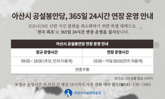 ¾Æ»ê½Ã °ø¼³ºÀ¾È´ç, 365ÀÏ 24½Ã°£ ¿¬Àå ¿î¿µ