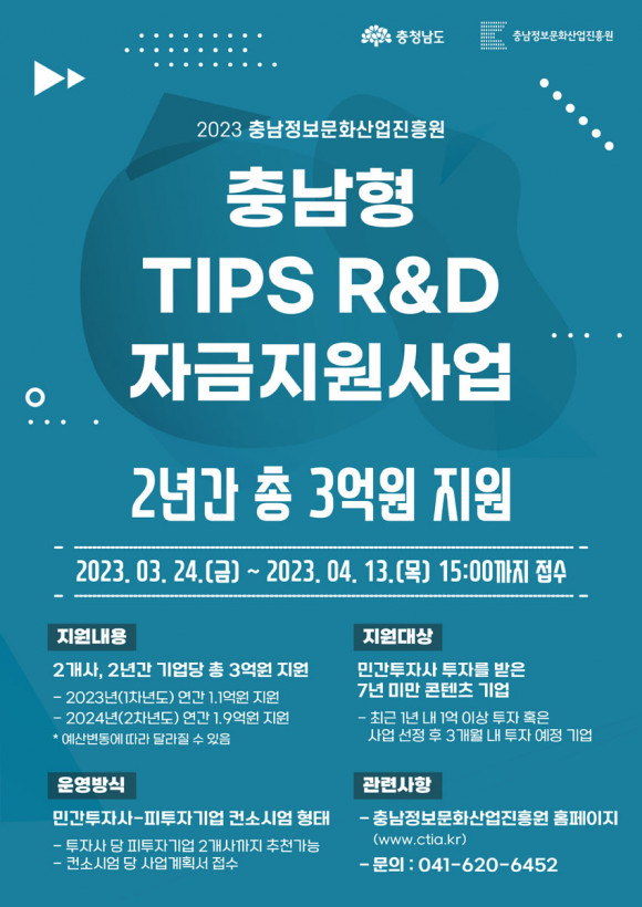 ÃæÃ»³²µµ¿Í Ãæ³²Á¤º¸¹®È»ê¾÷ÁøÈï¿ø(¿øÀå ±èâ¼ö, ÀÌÇÏ ÁøÈï¿ø)ÀÌ 2023³â ¹Î°£ÅõÀÚ¿¬°èÇü Ãæ³² TIPS R&D ÀÚ±ÝÁö¿ø»ç¾÷¿¡ Âü¿©ÇÒ ¹Î°£ÅõÀÚ»ç-7³â¹Ì¸¸ÀÇ ÇÇÅõÀÚ ÄÜÅÙÃ÷ ±â¾÷À» ¸ðÁýÇϰí ÀÖ´Ù.