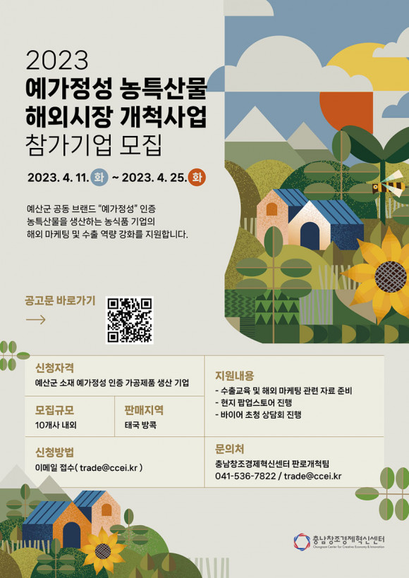 Ãæ³²Ã¢Á¶°æÁ¦Çõ½Å¼¾ÅÍ(¼¾ÅÍÀå °ÈñÁØ)´Â ¿¹»ê±º°ú ÇÔ²² ¿¹°¡Á¤¼º ÀÎÁõ °¡°øÁ¦Ç° »ý»ê±â¾÷À» ´ë»óÀ¸·Î ³óƯ»ê¹° À¯¸Áǰ¸ñ À°¼º°ú ÇØ¿Ü½ÃÀå °æÇèÀ» ÅëÇÑ ¼öÃâ ¿ª·®°È¸¦ µµ¸ðÇϱâ À§ÇØ 2023³â ¿¹°¡Á¤¼º ³óƯ»ê¹° ÇØ¿Ü½ÃÀå °³Ã´»ç¾÷ Âü°¡±â¾÷À» ¿À´Â 4¿ù 25ÀϱîÁö ¸ðÁý ÁßÀÌ´Ù.