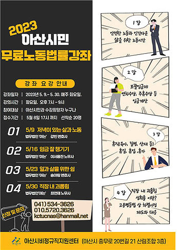 2023³â¿¡´Â 5¿ù 9ÀϺÎÅÍ 30ÀϱîÁö ¸ÅÁÖ È¿äÀÏ 19½Ã¿¡ ÃÑ 4°¿¡ °ÉÃÄ ³ëµ¿¹ý·üÀü¹®°¡¸¦ ÃʺùÇØ ¡ã1° Àú³áÀÌ ÀÖ´Â »î°ú ³ëµ¿ ¡ã2° ÀÓ±Ý Àß Ã¬±â±â ¡ã3° Àϰú »îÀ» À§ÇÑ ½° ¡ã4° Á÷Àå ³» ±«·ÓÈûÀ» ÁÖÁ¦·Î ¼¾ÅÍ ±³À°½Ç(¾Æ»ê½Ã»ê¸²Á¶ÇÕ 3Ãþ)¿¡¼ ÁøÇàÇÑ´Ù.