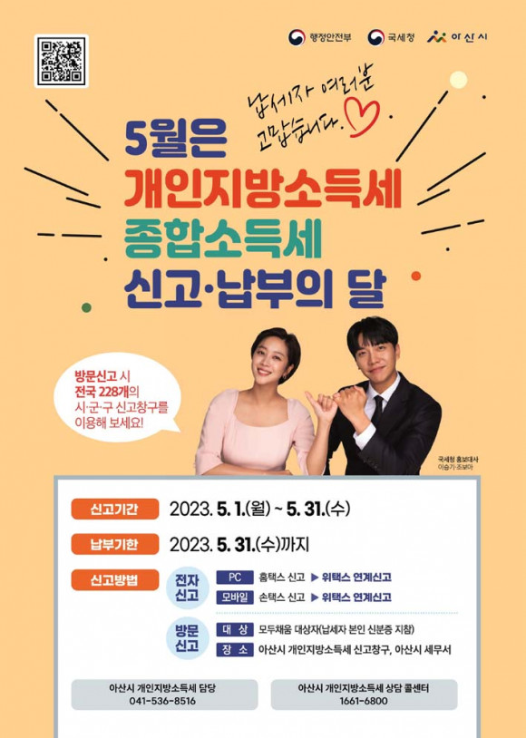 ¾Æ»ê½Ã(½ÃÀå ¹Ú°æ±Í)°¡ 5¿ù 1ÀϺÎÅÍ 31ÀϱîÁö Á¾Çռҵ漼¿Í °³ÀÎÁö¹æ¼Òµæ¼¼¸¦ ½Å°íÇÒ ¼ö ÀÖ´Â ½Å°íⱸ¸¦ ¿î¿µÇÑ´Ù.