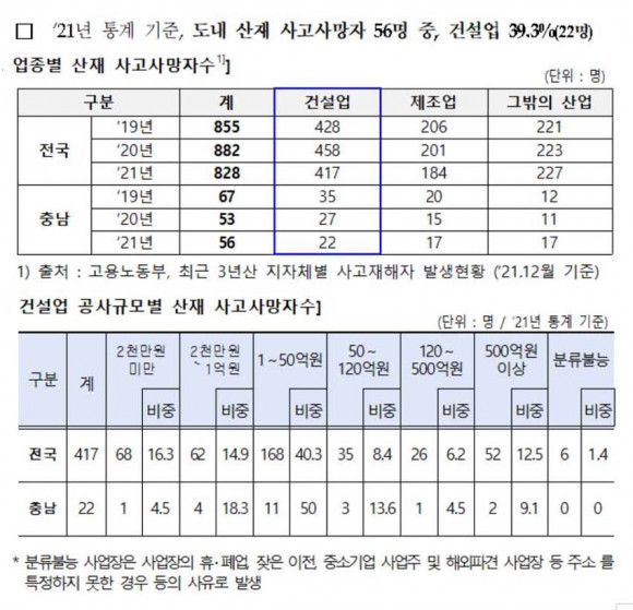 µµ´Â µµ³» »ê¾÷ÀçÇØ »ç°í »ç¸ÁÀÚÀÇ Àý¹Ý °¡±îÀ̰¡ °Ç¼³°ø»ç ÇöÀå¿¡¼ ¹ß»ýÇϰí, ÀÌ Áß 20% ÀÌ»óÀÌ ¼Ò±Ô¸ð ÇöÀå¿¡¼ ¹ß»ýÇÑ ¸¸Å, ÀûÁ¤ °ø»çºñ ÁؼöÀ² Çâ»óÀ» À§ÇØ ÇàÁ¤·ÂÀ» ÁýÁßÇÒ ¹æÄ§ÀÌ´Ù.