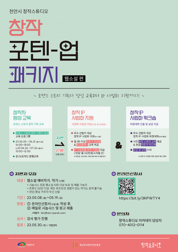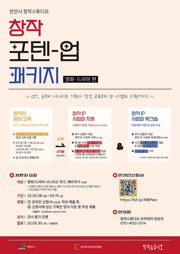 Ãæ³²Á¤º¸¹®È»ê¾÷ÁøÈï¿ø(¿øÀå ±èâ¼ö, ÀÌÇÏ ÁøÈï¿ø)ÀÌ ¿î¿µÇϴ õ¾È½Ã âÀÛ½ºÆ©µð¿À°¡ 5¿ù 8ÀϺÎÅÍ 19ÀϱîÁö ¡®Ã¢ÀÛ Æ÷ÅÙ-¾÷ ÆÐŰÁö(¿µÈ¡¤µå¶ó¸¶/ À¥¼Ò¼³)¡¯ ±³À°»ýÀ» ¸ðÁýÇÑ´Ù.