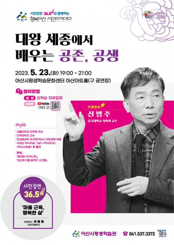 ¾Æ»ê½Ã(½ÃÀå ¹Ú°æ±Í)°¡ ¿À´Â 5¿ù 23ÀÏ ¿ÀÈÄ 7½Ã ¾Æ»ê½ÃÆò»ýÇнÀ°ü ¾Æ»ê¾ÆÆ®È¦(±¸ °ø¿¬Àå)¿¡¼ ¿ª»çÇÐÀÚ ½Åº´ÁÖ ±³¼öÀÇ ¡®´ë¿Õ ¼¼Á¾¿¡¼ ¹è¿ì´Â °øÁ¸, °ø»ý¡¯ ÁÖÁ¦ÀÇ Çູ¾Æ»ê ½Ã¹Î ¾ÆÄ«µ¥¹Ì Ư°À» °³ÃÖÇÑ´Ù.
