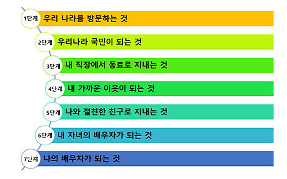 ÁøÇàµÈ ¼³¹®Àº º¸°¡´õ½º ôµµ·Î 1´Ü°è ¡®¿ì¸®³ª¶ó¸¦ ¹æ¹®ÇÏ´Â °Í¡¯¿¡¼ 7´Ü°è ¡®³ªÀÇ ¹è¿ìÀÚ°¡ µÇ´Â °Í¡¯±îÁö ¿Ü±¹ÀÎ Áֹΰú ³ªÀÇ ½É¸®ÀûÀÎ °Å¸®°¨À» Ç¥½ÃÇÏ´Â °ÍÀ¸·Î ÁøÇàµÆÀ¸¸ç, Âü¿©ÀÚ ÃÑ 167¸í Áß 58¸í(34.7%)°¡ 4´Ü°è ¡®³» °¡±î¿î ÀÌ¿ôÀÌ µÇ´Â °Í¡¯À̶ó°í ´äÇßÀ¸¸ç, ´ÙÀ½À¸·Î 5´Ü°è ¡®³ª¿Í ÀýÄ£ÇÑ Ä£±¸·Î Áö³»´Â °Í¡¯(33¸í, 19.8%), 2´Ü°è ¡®¿ì¸®³ª¶ó ±¹¹ÎÀÌ µÇ´Â °Í¡¯(26¸í, 15.6%)·Î ´äÇß´Ù.