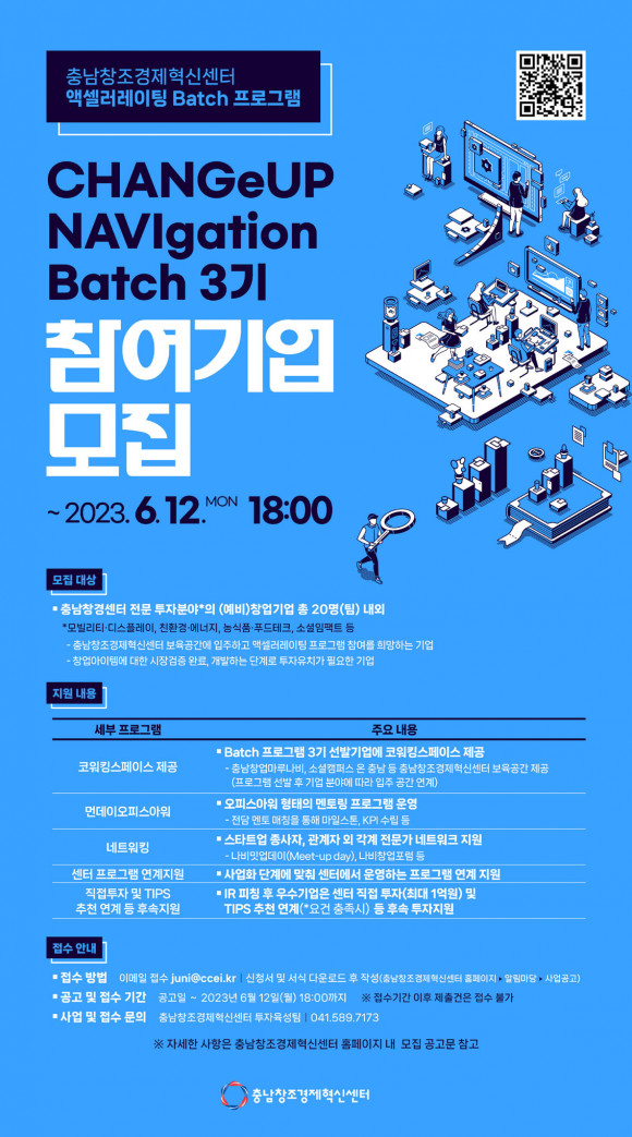 Ãæ³²Ã¢Á¶°æÁ¦Çõ½Å¼¾ÅÍ(¼¾ÅÍÀå °ÈñÁØ)´Â 2023³â CHANGeUP NAVIgation Batch 3±â Âü¿©±â¾÷À» ¿À´Â 6¿ù 12ÀÏ 18½Ã±îÁö ¸ðÁýÇÑ´Ù°í 5¿ù 24ÀÏ ¹àÇû´Ù.