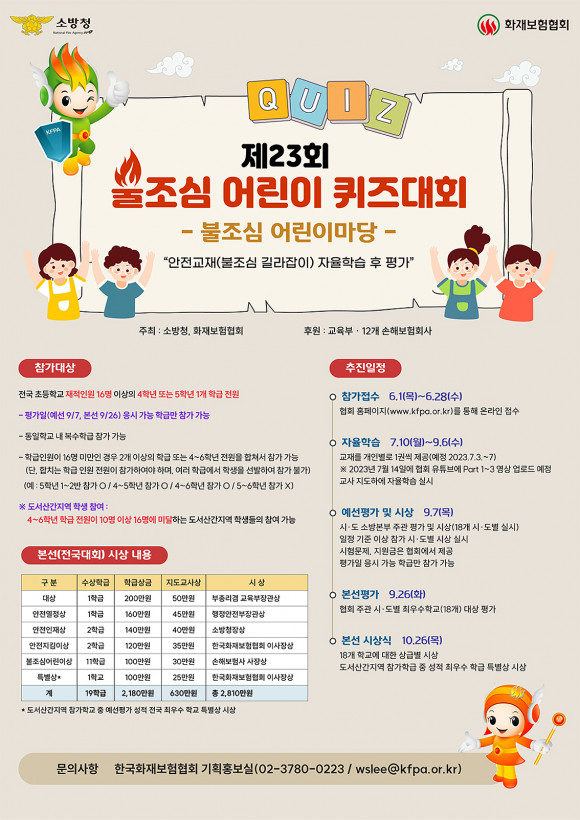 ¾Æ»ê¼Ò¹æ¼(¼Àå ±¸µ¿Ã¶)´Â ¾î¸°À̵éÀÇ ¾ÈÀü¹®È Á¤Âø°ú ¹Ì·¡ÀÇ ¾ÈÀü ÁöÅ´ÀÌ À°¼ºÀ» À§ÇÑ `Á¦23ȸ ºÒÁ¶½É ¾î¸°À̸¶´ç`¿¡ Âü¿©ÇÒ ÇбÞÀ» ¿À´Â 6¿ù 28ÀϱîÁö ¸ðÁýÇÑ´Ù°í ¹àÇû´Ù.