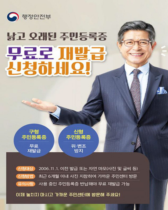 ¾Æ»ê½Ã(½ÃÀå ¹Ú°æ±Í) À¾¸éµ¿ ÇàÁ¤º¹Áö¼¾ÅÍ¿¡ ¹æ¹®ÇÏ¸é »çÁø, ±Û¾¾ µîÀÌ ÀÚ¿¬ÀûÀ¸·Î ¸¶¸ðµÆ°Å³ª 2006³â 11¿ù 1ÀÏ ÀÌÀü¿¡ ¹ß±ÞµÅ º¸¾È ±â´É Ãß°¡°¡ ÇÊ¿äÇÑ Áֹεî·ÏÁõÀ» ¹«·á·Î Àç¹ß±Þ¹ÞÀ» ¼ö ÀÖ´Ù.