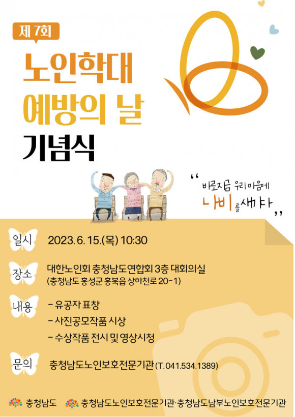 Á¦7ȸ ³ëÀÎÇÐ´ë ¿¹¹æÀÇ ³¯ ±â³ä½ÄÀÌ ¿À´Â 6¿ù 15ÀÏ ´ëÇѳëÀÎȸ ÃæÃ»³²µµ¿¬ÇÕȸ 3Ãþ ´ëȸÀǽǿ¡¼ ¿ÀÀü 10½Ã 30ºÐ¿¡ °³ÃֵȴÙ.
