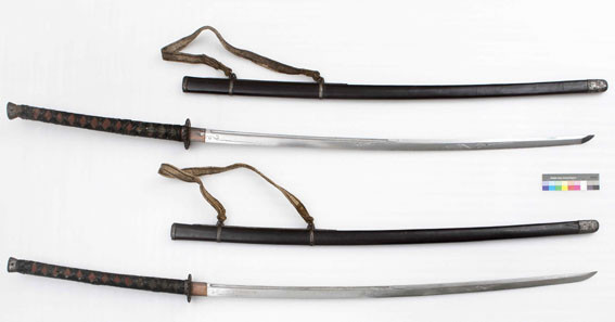Àåµµ1°ú Àåµµ2ÀÇ Ä®ÀÚ·ç´Â ¸ðµÎ ³ª¹«¿¡ ¾îÇÇ(åàù«)¸¦ °¨½Î°í ºÓÀº Ä¥À» ÇßÀ¸¸ç, Ä®ÀÚ·çÀÇ ÀϺκп¡ Á÷»ç°¢ÇüÀÇ ±Ý¼ÓÆÇÀ» ´í ÈÄ °ËÀº Ä¥À» ÇÑ °¡Á× ²öÀ» XÀÚ·Î ±³Â÷ÇØ °¨¾Æ Ä®Àڷ縦 Àâ¾ÒÀ» ¶§ ¹Ì²ô·¯ÁöÁö ¾Êµµ·Ï Çß´Ù.