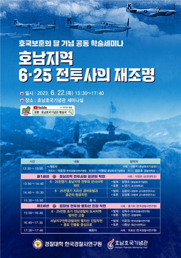 °æÂû´ëÇÐ Çѱ¹°æÂû»ç¿¬±¸¿ø(¿øÀå ÀÌÀ±Á¤ ±³¼ö)Àº È£³²È£±¹±â³ä°ü°ú °øµ¿ ÁÖ°üÀ¸·Î 6¿ù 22ÀÏ ¿ÀÈÄ 1½Ã 30ºÐºÎÅÍ 5½Ã 40ºÐ±îÁö È£³²È£±¹±â³ä°ü ¼¼¹Ì³ª½Ç¿¡¼ 6¡¤25ÀüÀï»ç ¿¬±¸ÀÚ µî Çаè Àλç 50¿© ¸íÀÌ Âü¼®ÇÑ °¡¿îµ¥ ¡®È£³²Áö¿ª 6¡¤25ÀüÅõ»çÀÇ ÀçÁ¶¸í¡¯À̶ó´Â ÁÖÁ¦·Î ÇмúÅä·Ðȸ¸¦ °³ÃÖÇß´Ù.