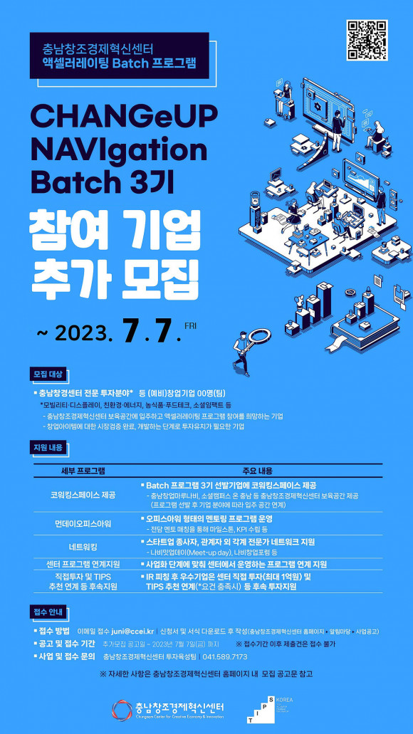 Ãæ³²Ã¢Á¶°æÁ¦Çõ½Å¼¾ÅÍ(¼¾ÅÍÀå °ÈñÁØ)´Â 2023³â CHANGeUP NAVIgation Batch 3±â Âü¿©±â¾÷À» ¿À´Â 7¿ù 7ÀϱîÁö Ãß°¡ ¸ðÁýÇÑ´Ù°í 6¿ù 26ÀÏ ¹àÇû´Ù.