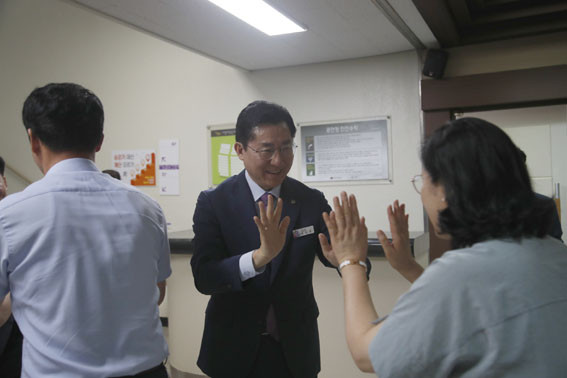 ±â³ä»ç¸¦ ¸¶Ä£ ¹Ú ½ÃÀåÀº ½Ã¹ÎȦ ÀÔ±¸¿¡¼ Á÷¿øµé°ú ÇÏÀÌ ÆÄÀ̺긦 ³ª´©°í °¨»çÀÇ Àλ縦 ÀüÇÏ´Â »óÈ£°Ý·ÁÀÇ ½Ã°£À» °¡Á³´Ù.
