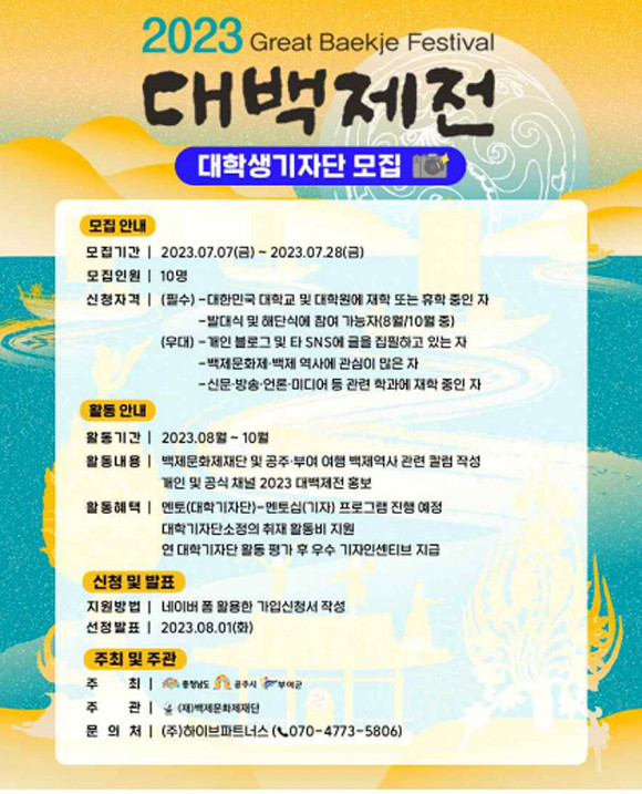 Àü±¹ ÃÖ´ë ¿ª»ç¹®ÈÃàÁ¦¡®2023 ´ë¹éÁ¦Àü¡¯ÀÇ ÃàÁ¦ ÇöÀåÀ» »ý»ýÇÏ°Ô ÃëÀçÇϰí È«º¸ ÄÜÅÙÃ÷¸¦ ¹ß±¼Çϱâ À§ÇÑ SNS ´ëÇÐ ±âÀÚ´ÜÀ» ¸ðÁýÇÑ´Ù. (Àç)¹éÁ¦¹®ÈÁ¦Àç´ÜÀº SNS ´ëÇбâÀÚ´ÜÀ» 7¿ù 28ÀϱîÁö ¸ðÁýÇÑ´Ù°í Áö³ 11ÀÏ ¹àÇû´Ù.