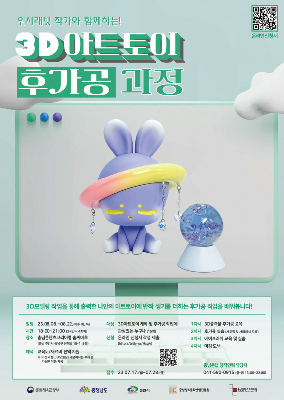 8¿ù 8ÀϺÎÅÍ 22ÀÏ ±îÁö ¸ÅÁÖ È¿äÀϰú ¸ñ¿äÀÏ 3½Ã°£¾¿ ÁøÇàµÇ¸ç, 3D ¾ÆÆ®ÅäÀÌ Á¦ÀÛ¿¡ °ü½ÉÀÖ´Â Ãæ³²µµ³» ¼ÒÀç ´ëÇлý, µµ¹ÎÀ̶ó¸é ´©±¸³ª ½ÅûÇÒ ¼ö ÀÖ´Ù.