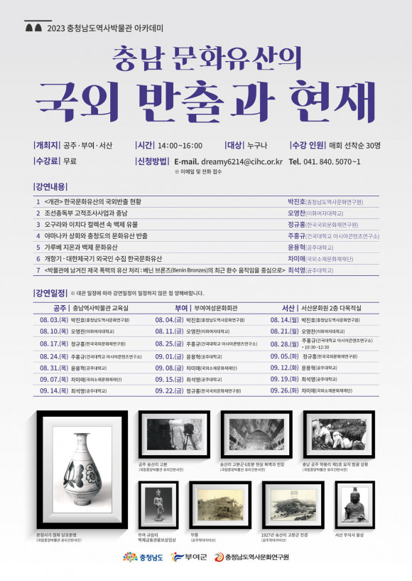 À̹ø ¾ÆÄ«µ¥¹Ì´Â 8¿ù 3ÀϺÎÅÍ 9¿ù 26ÀϱîÁö °øÁÖ Ãæ³²¿ª»ç¹Ú¹°°ü ±³À°½Ç¤ýºÎ¿©¿©¼º¹®Èȸ°ü¤ý¼»ê¹®È¿ø¿¡¼ ¡®Ãæ³² ¹®ÈÀ¯»êÀÇ ±¹¿Ü ¹ÝÃâ°ú ÇöÀ硯¶ó´Â ÁÖÁ¦·Î Àü¹®°¡µéÀ» ÃʺùÇØ °¢ 7ȸ¾¿ ¿î¿µµÈ´Ù.