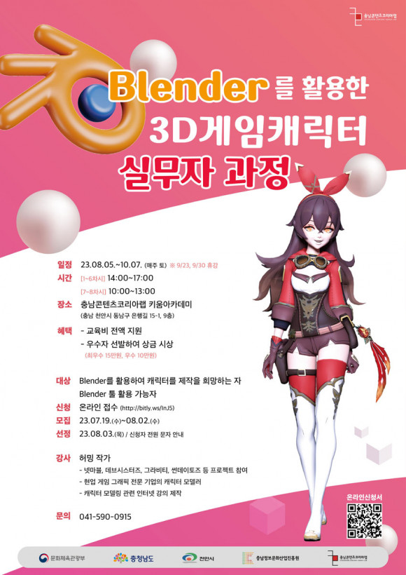 8¿ù 5ÀϺÎÅÍ 10¿ù 7ÀϱîÁö ¸ÅÁÖ Åä¿äÀÏ, 3½Ã°£¾¿ ÁøÇàµÇ¸ç, ºí·»´õ¸¦ Ȱ¿ëÇØ °ÔÀÓ Ä³¸¯ÅÍ Á¦ÀÛÀ» Èñ¸ÁÇϰųª, Åø »ç¿ë¿¡ °ü½É ÀÖ´Â Ãæ³²µµ³» ¼ÒÀç ´ëÇлý, Ãë¾÷Áغñ»ý, µµ¹ÎÀ̶ó¸é ´©±¸³ª ½ÅûÇÒ ¼ö ÀÖ´Ù.
