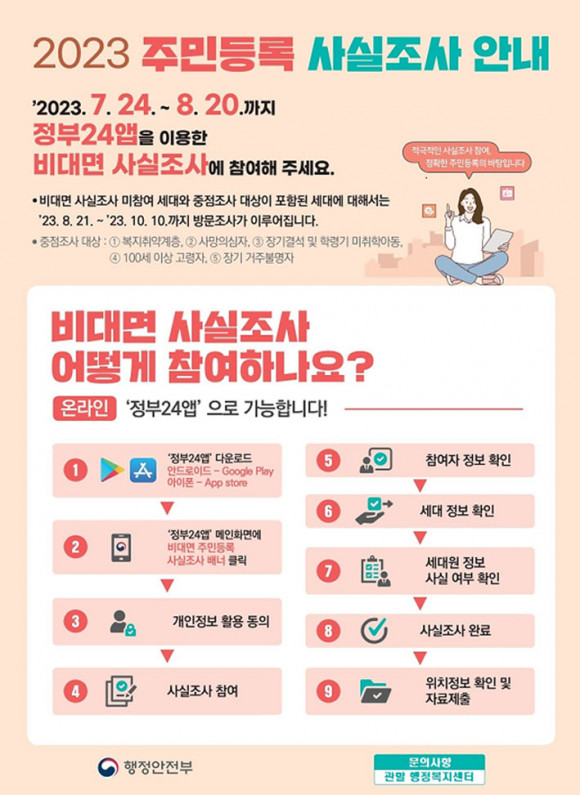 À̹ø »ç½ÇÁ¶»ç´Â Á¤ºÎ24 ¾ÛÀ» ÅëÇÑ ºñ´ë¸é-µðÁöÅÐ Á¶»ç(7¿ù 24ÀÏ¡8¿ù 20ÀÏ)¸¦ ÁøÇàÇÑ ÀÌÈÄ, ÀÌ¡¤ÅëÀå ¹× À¾¡¤¸é¡¤µ¿ °ø¹«¿øÀÌ °ÅÁÖÁö¿¡ ¹æ¹®ÇØ È®ÀÎÇÏ´Â ¹æ½ÄÀ¸·Î Á¶»ç(8¿ù 21ÀÏ¡10¿ù 10ÀÏ)°¡ ÁøÇàµÈ´Ù.