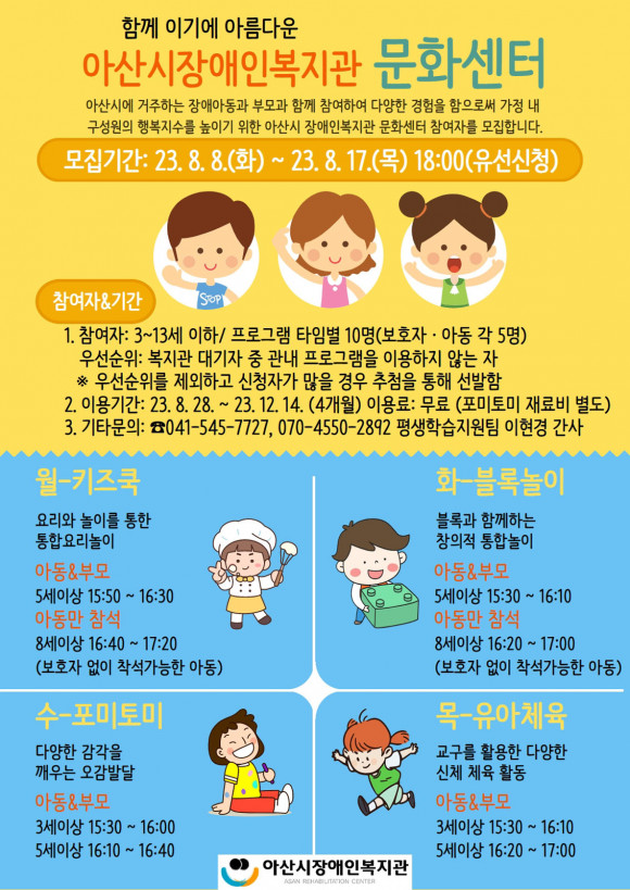 ¹®È¼¾ÅÍ ÇÁ·Î±×·¥Àº ¿ì¸® Áö¿ª Àå¾Ö¾Æµ¿ ¹× °¡Á·À» À§ÇÑ ÇÁ·Î±×·¥À¸·Î Àå¾Ö¾Æµ¿ÀÇ ¿ª·®°È ¹× °¡Á· °£ÀÇ ±àÁ¤Àû »óÈ£Çൿ Çâ»óÀ» À§ÇØ ¿î¿µµÇ°í ÀÖ´Ù.