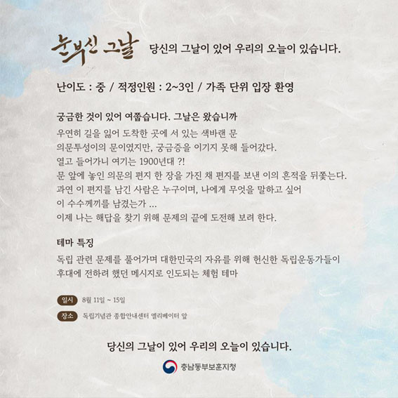 ƯÈ÷ À̹ø ¹æÅ»Ã⠺νº´Â Å׸¶°¡ µ¶¸³¿¡ ¸ÂÃçÁ® ÀÖ¾î¼ 100¿©³â Àü ³ª¶óÀÇ µ¶¸³À» À§ÇØ ¸ñ¼û ¹ÙÄ¡½Å µ¶¸³¿îµ¿°¡µéÀÌ Çö´ë¸¦ »ç´Â ¿ì¸®¿¡°Ô ¾î¶² ¸Þ½ÃÁö¸¦ º¸³»°íÀÚ ÇÏ´ÂÁö Âü¿©ÀÚ°¡ ´Éµ¿ÀûÀ¸·Î ½ºÅ丮Çü ¹®Á¦¸¦ Ç®¾î°¡¸ç ¾Ë¾Æ°¥ ¼ö Àִ üÇè ÄÜÅÙÃ÷·Î ±¸¼ºµÇ¾î ¿î¿µ ÀüºÎÅÍ ¸¹Àº °ü½ÉÀ» ¹Þ°í ÀÖ´Ù.