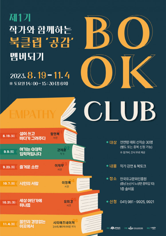 ÇÑÀ¯Áø Á¦1±â ºÏŬ·´ ¡®°ø°¨¡¹¡¯È¸¿øÀº ÇöÀç ¼±Âø¼øÀ¸·Î ¼ö½Ã ¸ðÁý ÁßÀ̸ç, Âü°¡ºñ´Â ¹«·á´Ù. °¢ ȸ º°µµ ½Åû ¶ÇÇÑ °¡´ÉÇϰí À¯¼± Á¢¼ö(¢Ï 041-981-9925, 9921)¸¦ ÅëÇØ ½ÅûÇÒ ¼ö ÀÖ´Ù.