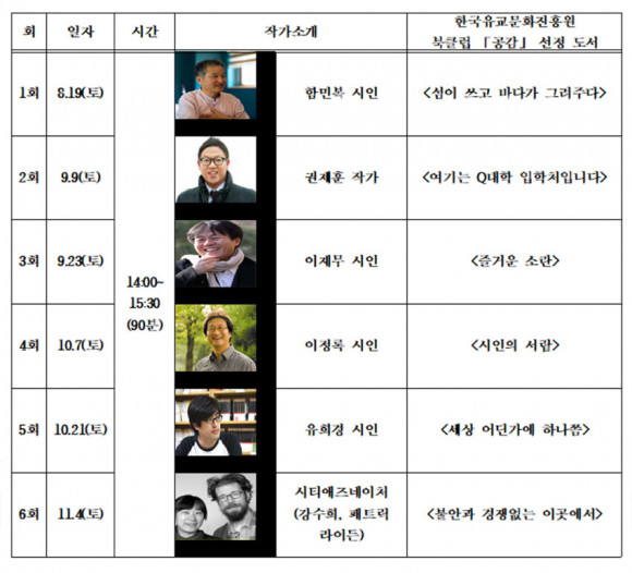 Çѱ¹À¯±³¹®ÈÁøÈï¿ø(¿øÀå Á¤Àç±Ù, ÀÌÇÏ¡®ÇÑÀ¯Áø¡¯)Àº ¿À´Â 8¿ù 19ÀϺÎÅÍ 11¿ù 4ÀϱîÁö Åä¿äÀÏ ¿ÀÈÄ¿¡ ÃÑ 6ȸ¿¡ °ÉÃÄ, ÀÛ°¡¿Í ÇÔ²²ÇÏ´Â Á¦1±â ºÏŬ·´ ¡®°ø°¨¡¯À» ¿î¿µÇÑ´Ù.