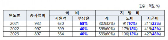 ¿ÃÇØÀÇ °æ¿ì ÃÑ»ç¾÷ºñ 897¾ï ¿ø Áß ±¹ºñ°¡ 364¾ï ¿ø(40%), Áö¹æºñ 533¾ï ¿ø(60%)À̸ç, ƯÈ÷ µµºñ°¡ 106¾ï ¿ø(12%), ½Ã¡¤±ººñ°¡ 427¾ï ¿ø(48%)À¸·Î ±âÃÊÀÚÄ¡´ÜüÀÇ ºÎ´ãÀÌ Á¡Á¡ ´Ã¾î³ °ÍÀ¸·Î ¹àÇôÁ³´Ù.