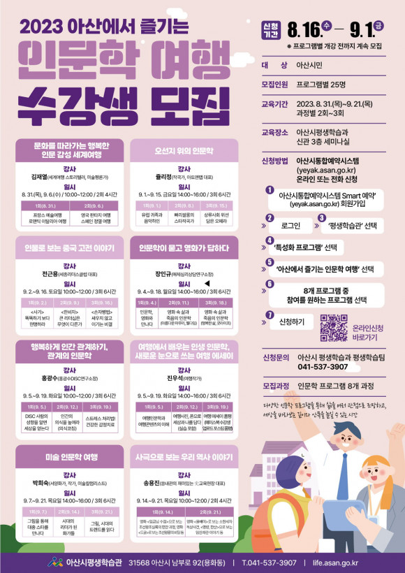 ÇÑÆí, 8°³ Àι®ÇÐ ÇÁ·Î±×·¥º° ÀÏÁ¤°ú ±³À°³»¿ë, ±×¸®°í ¼ö° ½Åû°ú °ü·ÃÇÑ ÀÚ¼¼ÇÑ »çÇ×Àº ¾Æ»ê½ÃÆò»ýÇнÀ°ü(life.asan.go.kr) ´©¸®Áý °øÁö »çÇ×À» Âü°íÇϰųª, ¾Æ»ê½Ã Æò»ýÇнÀ°ú(041-537-3907)·Î ¹®ÀÇÇÏ¸é µÈ´Ù.