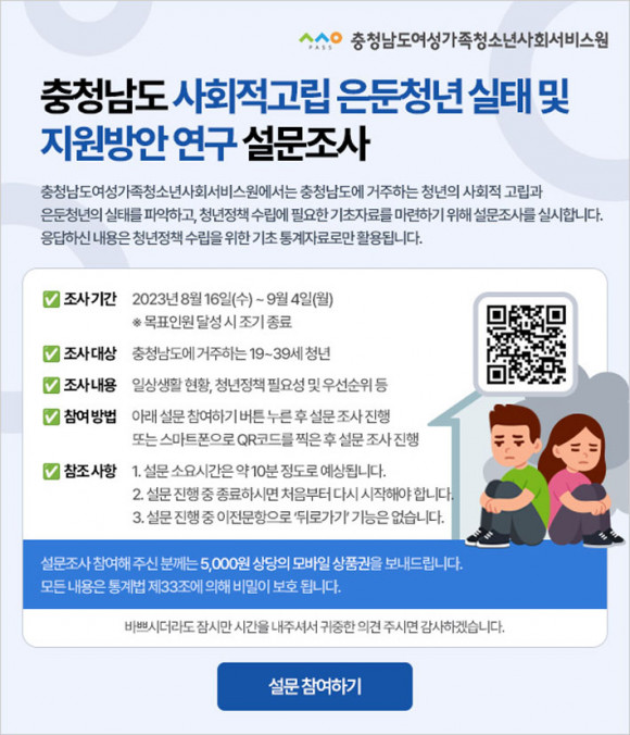ÃæÃ»³²µµ¿©¼º°¡Á·Ã»¼Ò³â»çȸ¼ºñ½º¿ø(¿øÀå Á¶°æÈÆ)Àº 8¿ù 16ÀϺÎÅÍ 9¿ù 4ÀϱîÁö ¡®»çȸÀû°í¸³¡¤ÀºµÐ û³â ½ÇÅÂÁ¶»ç¡¯¸¦ ½Ç½ÃÇÑ´Ù°í ¹àÇû´Ù.