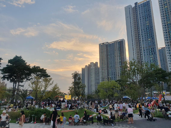 ÁֹεéÀº ³ÐÀº °ø¿ø Àܵð¹ç¿¡ µ¾ÀÚ¸®, ±×´Ã¸·À» ÆîÄ¡°í »ï»ï¿À¿À ¾É¾Æ Àϻ󿡼 ¹þ¾î³ª ³·ºÎÅÍ ¹ã±îÁö ÃàÁ¦¸¦ Áñ°å´Ù.