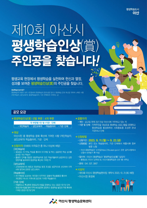 ¸ðÁý ±â°£Àº 9¿ù 11~22ÀÏÀ̸ç, ¾Æ»ê½Ã Æò»ýÇнÀ°ú·Î ¹æ¹® ½ÅûÇÏ¸é µÈ´Ù. ½Ã»óÀº ¡®Á¦10ȸ ¾Æ»ê½Ã Æò»ýÇнÀÇѸ¶´ç(10¿ù 21ÀÏ, ½ÅÁ¤È£¼ö°ø¿ø ¾ß¿ÜÀ½¾Ç´ç) °³¸·½Ä¿¡¼ ÀÌ·ïÁú ¿¹Á¤ÀÌ´Ù.