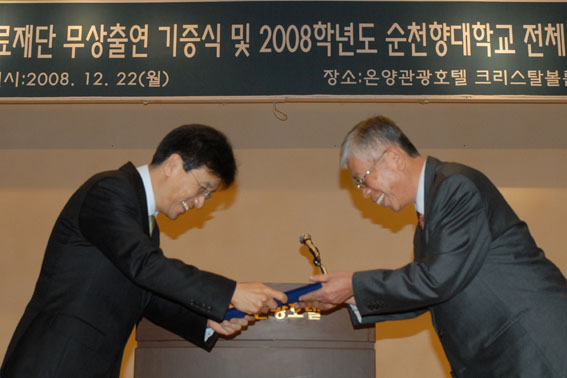 ¼øÃµÇâ´ëÇб³ ¼±³ÀÏ ÃÑÀåÀÌ 650¾ï¿ø »ó´çÀÇ ÀÚ»êÀ» ´ëÇÐ Ãø¿¡ ±âºÎÇß´Ù. ¼øÃµÇâ´ëÇб³´Â Áö³ 12¿ù 22ÀÏ ¿ÀÈÄ6½Ã ¿Â¾ç°ü±¤È£ÅÚ¿¡¼ ¿¸° ¡®2008 ±³¼ö ¼Û³âȸ¡¯¿¡¼ ¼±³ÀÏ ÃÑÀåÀÌ °³ÀμÒÀ¯ÀÇ ÀÚ»êÀÎ ÀÇ·á¹ýÀÎ µ¿ÀºÀÇ·áÀç´Ü°ú ÀÇ·áÀç´Ü ¼Ò¼Ó ¼øÃµÇâ´ëÇб³ õ¾Èº´¿ø, ¼øÃµÇâ´ëÇб³ ±¸¹Ìº´¿øÀ» ¹«»óÀ¸·Î Çб³¹ýÀÎ µ¿ÀºÇпø(¼øÃµÇâ´ëÇб³)¿¡ Ã⿬Çß´Ù°í ¹àÇû´Ù. ¼øÃµÇâ´ëÇб³ õ¾È, ±¸¹Ìº´¿øÀÇ °¨Á¤Æò°¡´Â 650¿©¾ï¿øÀÌ¸ç °¢ º´¿øÀÇ ÀÇ·áÀÎÇÁ¶ó¸¦ Æ÷ÇÔÇÑ ÀÎÁöµµ ¹× ºê·£µå °¡Ä¡ µîÀ» Æ÷ÇÔÇßÀ» ¶§ ¾à 2õ500¾ï ¿ø¿¡ À̸£´Â ±Ô¸ð·Î ÃßÁ¤Çϰí ÀÖ´Ù. ÀÌ ³¯ ¹«»ó Ã⿬¿¡ ´ëÇÑ ±âÁõÀº ¼±³ÀÏ ÃÑÀåÀÌ Çб³¹ýÀÎ µ¿ÀºÇпø(ÀÌ»çÀå ±èÁ¤¿Á)ÀÇ ¹Úų² À̻翡°Ô ±âÁõ¼¸¦ Àü´ÞÇϰí Çб³¹ýÀÎ »êÇÏ ÀÓÁ÷¿ø Àϵ¿ ¸íÀÇ·Î °¨»çÆÐ°¡ ÀüÇØÁ³´Ù. | | | ¡ã 22ÀÏ Àüü±³¼öȸÀÇ¿¡¼ ¼±³ÀÏ ÃÑÀå(¿ÞÂÊ)ÀÌ Çб³¹ýÀÎ µ¿ÀºÇпøÀÇ ¹Úų²(¿À¸¥ÂÊ) À̻翡°Ô µ¿ÀºÀÇ·áÀç´Ü(õ¾Èº´¿ø, ±¸¹Ìº´¿ø) ¹«»óÃ⿬¿¡ ´ëÇÑ ±âÁõ¼¸¦ Àü´ÞÇß´Ù. |
