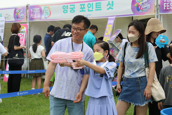 °ÔÀÓ À̺¥Æ®Á¸¿¡¼´Â ±â½ÂÀ» ºÎ¸®´Â ¸¶Áö¸· ¹«´õÀ§¸¦ ³¯·Á¹ö¸± ¡®¹°ÃÑ »ç°Ý¿Õ¡¯À» ÁøÇàÇß´Ù. Âü¿©ÇÑ ¹æ¹®°´µéÀº ³²³à³ë¼Ò ³ªÀ̸¦ ºÒ¹®ÇÏ°í ¾î¸° µ¿½ÉÀ¸·Î µ¹¾Æ°¡ Áñ°Å¿î ½Ã°£À» º¸³Â´Ù.