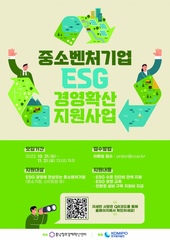 Ãæ³²Ã¢Á¶°æÁ¦Çõ½Å¼¾ÅÍ(ÀÌÇÏ ¡®Çõ½Å¼¾ÅÍ¡¯)´Â Çõ½Å¼¾ÅͰ¡ ÁÖ°üÇϰí Çѱ¹ÁߺιßÀüÀÌ ÈÄ¿øÇÏ´Â ¡®Áß¼Òº¥Ã³±â¾÷ ESG °æ¿µÈ®»ê Áö¿ø»ç¾÷¡¯À» 11¿ù 21ÀϱîÁö ¸ðÁýÇÑ´Ù°í ¹àÇû´Ù.