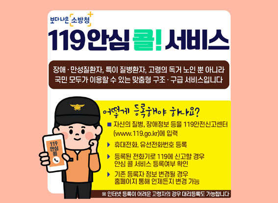 ¡®119¾È½ÉÄÝ ¼ºñ½º¡¯´Â ÀÀ±Þ»óȲ ¹ß»ý ½Ã 119·Î ½Å°íÇÏ°Ô µÇ¸é ±¸±Þ´ë¿øÀÌ »çÀü µî·ÏµÈ ½Å°íÀÚ(ȯÀÚ)ÀÇ º´·Â°ú Ư¼ºÀ» ÆÄ¾ÇÇØ ½Å¼ÓÇÑ ÇöÀå ÀÀ±Þóġ¿Í º´¿ø À̼ÛÀ» °¡´ÉÇÏ°Ô ÇÏ´Â ¼ºñ½º´Ù.