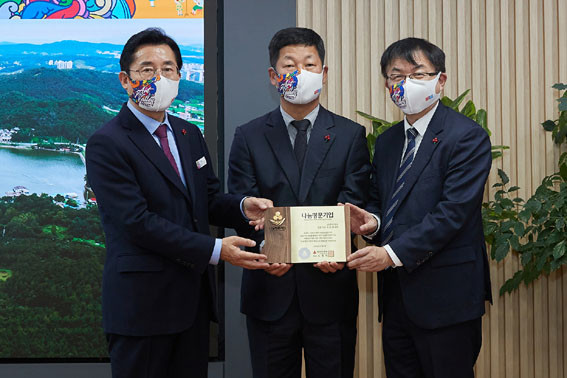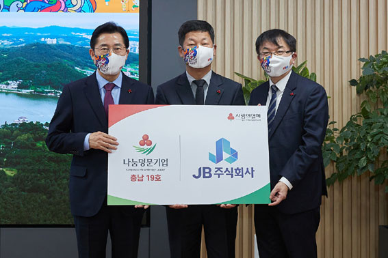 Ãæ³² »çȸº¹Áö°øµ¿¸ð±Ýȸ(ȸÀå ¼º¿ìÁ¾)°¡ Áö³ 11¿ù 29ÀÏ ¾Æ»ê½Ã(½ÃÀå ¹Ú°æ±Í)¸¦ ¹æ¹®ÇØ JBÁÖ½Äȸ»ç(´ëÇ¥ÀÌ»ç »çÀå ÇѱÇÈñ)¿¡ ¡®³ª´®¸í¹®±â¾÷¡¯ °¡ÀÔ ÀÎÁõÆÐ¸¦ Àü´ÞÇß´Ù.