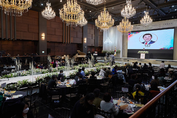 À̳¯ ¹Ú°æ±Í ¾Æ»ê½ÃÀå°ú ±èÈñ¿µ ¾Æ»ê½ÃÀÇȸ ÀÇÀå, ÀÚ¿øºÀ»çÀÚ µî 300¿© ¸íÀÌ Âü¼®ÇÑ °¡¿îµ¥ ¡®¼¼»ó¿¡¼ °¡Àå ¾Æ¸§´Ù¿î ´Ù¼¸ ±ÛÀÚ! »ç¶ûÇÕ´Ï´Ù. °í¸¿½À´Ï´Ù. ÀÚ¿øºÀ»çÀÚ¡¯¶ó´Â ½½·Î°ÇÀÇ ÈÇÕ°ú ¼ÒÅëÀÇ ÀåÀÌ ¸¶·ÃµÆ´Ù.