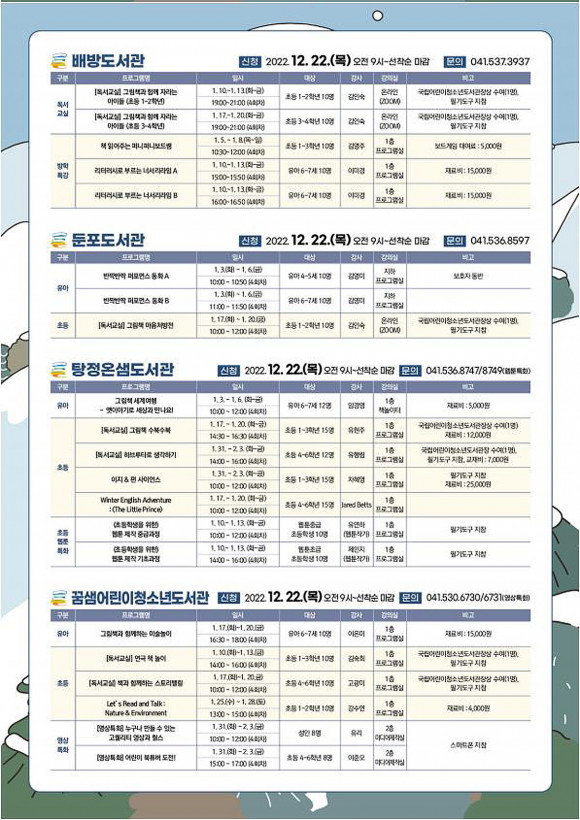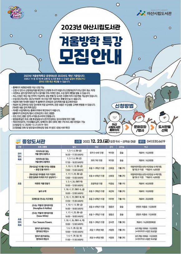 µµ¼°ü °ü°èÀÚ´Â ¡°°Ü¿ï¹æÇРƯ° ÇÁ·Î±×·¥À» ÅëÇØ Ã¥°ú ÇÔ²² º¸³»´Â ¸¶À½ µû¶æÇÑ °Ü¿ïÀÌ µÇ±æ ¹Ù¶õ´Ù¡±°í ¸»Çß´Ù. ÀÚ¼¼ÇÑ »çÇ×Àº ½Ã¸³µµ¼°ü ´©¸®Áý(ascl.asan.go.kr) ¶Ç´Â °³º° µµ¼°ü ÀüÈ ¹®ÀǸ¦ ÅëÇØ È®ÀÎÇÒ ¼ö ÀÖ´Ù.