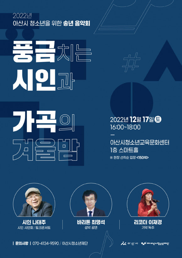| | ¡è¡è ¡ã¼Û³â À½¾Çȸ È«º¸¹° | ¨Ï ¿Â¾ç½Å¹® | | Àç´Ü¹ýÀÎ ¾Æ»ê½Ãû¼Ò³âÀç´Ü(ÀÌ»çÀå ½ÉÀå±Ù, ÀÌÇÏ ¡®Àç´Ü¡¯)ÀÌ ¿À´Â 12¿ù 17ÀÏ ¿ÀÈÄ 4½Ã ¾Æ»ê½Ãû¼Ò³â±³À°¹®È¼¾ÅÍ ½º¸¶Æ®È¦¿¡¼ ¾Æ»ê½Ã û¼Ò³âÀ» À§ÇÑ ¼Û³â À½¾Çȸ ¡®Ç³±Ý Ä¡´Â ½ÃÀΰú °¡°îÀÇ °Ü¿ï¹ã¡¯À» °³ÃÖÇÑ´Ù.