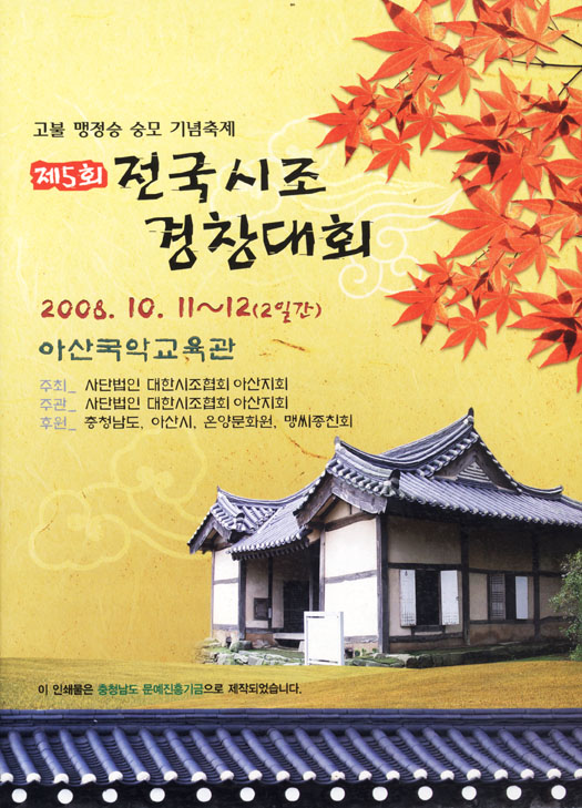 Àü±¹ÀÇ ½ÃÁ¶ ¸íÀΡ¤¸íâµéÀÌ ÇÑ ÀÚ¸®¿¡ ¸ð¿© °æ¿¬ÇÏ´Â Á¦5ȸ Àü±¹½ÃÁ¶°æÃ¢´ëȸ°¡ ¿À´Â 10¿ù 10~11ÀÏ ÀÌÆ²°£ ¾Æ»ê±¹¾Ç±³À°°ü(¿°Ä¡À¾ ¹æ¼ö¸¶À» ³»)¿¡¼ (»ç)´ëÇѽÃÁ¶Çùȸ ¾Æ»êÁöȸ(ÁöȸÀå ±èÆÇ¼ø) ÁÖÃÖ¡¤ÁÖ°üÀ¸·Î °³ÃֵȴÙ. À̹ø ½ÃÁ¶°æÃ¢´ëȸ´Â °íºÒ ¸ÍÁ¤½Â ¼þ¸ð±â³äÃàÁ¦ÀÇ ÀÏȯÀ¸·Î °³ÃֵǴ °ÍÀ¸·Î °Èñº¹ ½ÃÀåÀÌ ¸í¿¹´ëȸÀå, ±è½Ã°â ¿Â¾ç¹®È¿øÀåÀÌ ´ëȸÀåÀ» ¸Ã°í ±èÆÇ¼ø ÁöȸÀåÀÌ ÁýÇàÀ§¿øÀåÀ» ¸Ã¾Æ ÁøÇàÇÑ´Ù. ´ëȸ´Â ±¹Ã¢ºÎ(ÁßÇ㸮 »ç¼³ÁúÀ½, ¿ì½ÃÁ¶ ¿«À½ÁúÀ½)¡¤¸íÀκÎ(¿ìÁ¶ ÁúÀ½)¡¤Æ¯ºÎ(³²³àâ ÁúÀ½)¡¤°©ºÎ(»ç¼³½ÃÁ¶ 1¹øÃ¢)¡¤À»ºÎ(Æò½ÃÁ¶ 1¹øÃ¢)·Î ³ª´µ¾î °³ÃÖµÇ¸ç °¢ ºÎ °øÈ÷ ±Ý¡¤Àº¡¤µ¿¡¤Âü°¡»óÀ¸·Î ½Ã»óÇ쵂 ±¹Ã¢ºÎ´Â ±Ý»ó À§¿¡ Àå¿øÀ» ½Ã»óÇÑ´Ù. ÇÑÆí ´ëºÎºÐÀÇ ½ÃÁ¶°æÃ¢ÀÌ ±¹¾Ç°æ¿¬´ëȸÀÇ ÇÑ ÆÄÆ®·Î ÁøÇàµÇ´Â °æ¿ì°¡ ÀϹÝÀûÀ̳ª ¾Æ»ê¿¡¼ °³ÃÖÇÏ´Â ´ëȸ°¡ ¸ÍÁ¤½Â ¼þ¸ð ±â³äÃàÁ¦ÀÇ ÀÏȯÀ¸·Î °³ÃֵǴ °ÍÀº °íºÒ ¸Í»ç¼º Á¤½ÂÀÌ ¿¬½ÃÁ¶ÀÇ Ã¢½ÃÀڷμ ƯÈ÷ ¡®°È£»ç½Ã°¡¡¯ µî ¶Ù¾î³ ½ÃÁ¶¸¦ ´Ù¼ö âÀÛÇÔ¿¡ µû¶ó ÈļյéÀÇ ¼þ¸ðÀÇ Á¤ÀÌ ´õ¿í ±í±â ¶§¹®À¸·Î º¸ÀδÙ.