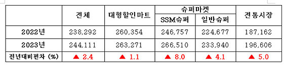 ÀÌÁß ´ëÇüÇÒÀθ¶Æ®ÀÇ °æ¿ì 1.1%°¡ ÀλóµÈ °ÍÀ¸·Î, SSM½´ÆÛ´Â 8.0%, ÀϹݽ´ÆÛ¸¶ÄÏÀº 4.1% °¢°¢ ¿À¸¥ °ÍÀ¸·Î ³ªÅ¸³µ´Ù. ÀüÅë½ÃÀåÀÇ °æ¿ìµµ 5.0% ¿À¸¥ °ÍÀ¸·Î ³ªÅ¸³µ´Ù.