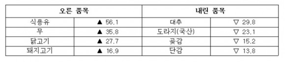 Àü³â´ëºñ °¡Àå ¸¹ÀÌ ¿À¸¥ ǰ¸ñÀº ½Ä¿ëÀ¯°¡ 56.1%·Î °¡Àå ³ô¾ÒÀ¸¸ç, ¹« 35.8%, ´ß°í±â 27.7%, µÅÁö°í±â°¡ 16.9%°¡ ¿Ã¶ú´Ù.