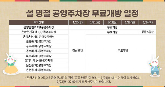 ¹«·á °³¹æ ±â°£Àº ¼³ ¸íÀý ¿¬ÈޱⰣÀÎ 1¿ù 21ÀϺÎÅÍ 24ÀϱîÁö 4ÀÏ °£À¸·Î, ¿Â¾ç¿Âõ¿ª Á¦4°ø¿µÁÖÂ÷ÀåÀÇ °æ¿ì ¿¬ÈÞ Àü³¯ÀÎ 20ÀϺÎÅÍ ÇÏ·ç ÀÏÂï ¹«·á °³¹æµÈ´Ù.