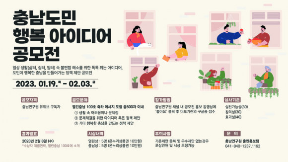 °ø¸ðÀÚ°ÝÀº Ãæ³²¿¬±¸¿ø À¯Æ©ºê ±¸µ¶ÀÚ¿¡ ÇÑÇϸç, ¿¬±¸¿ø ä³ÎÀÇ °ø¸ðÀü È«º¸ µ¿¿µ»ó¿¡ ¡®ÁÁ¾Æ¿ä¡¯ Ŭ¸¯ ÈÄ ´õº¸±â¶õÀÇ ¸µÅ©¸¦ ÅëÇØ Á¢¼öÇÏ¸é µÈ´Ù. °ø¸ð±â°£Àº 1¿ù 19ÀϺÎÅÍ 2¿ù 3ÀϱîÁöÀ̸ç, ÃÖÁ¾°á°ú´Â 2¿ù 8ÀÏ¿¡ ¹ßÇ¥µÉ ¿¹Á¤ÀÌ´Ù.