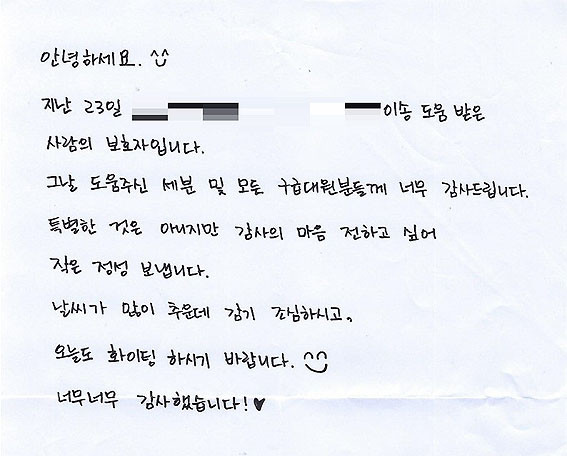 ±¸±Þ ¼öÇýÀÚ´Â ¡®±×³¯ µµ¿òÁֽб¸±Þ´ë¿øºÐµé²² ¸Å¿ì °¨»çµå¸°´Ù¡¯¸ç ¡®³¯¾¾°¡ ¸¹ÀÌ Ã߿ °¨±â Á¶½ÉÇÏ½Ã°í ÆÄÀÌÆÃ ÇϽñ⠹ٶõ´Ù¡¯¶ó°í °¨»çÀÇ ¶æÀ» ÆíÁö¿¡ ´ã¾Æ Àü´ÞÇß´Ù.