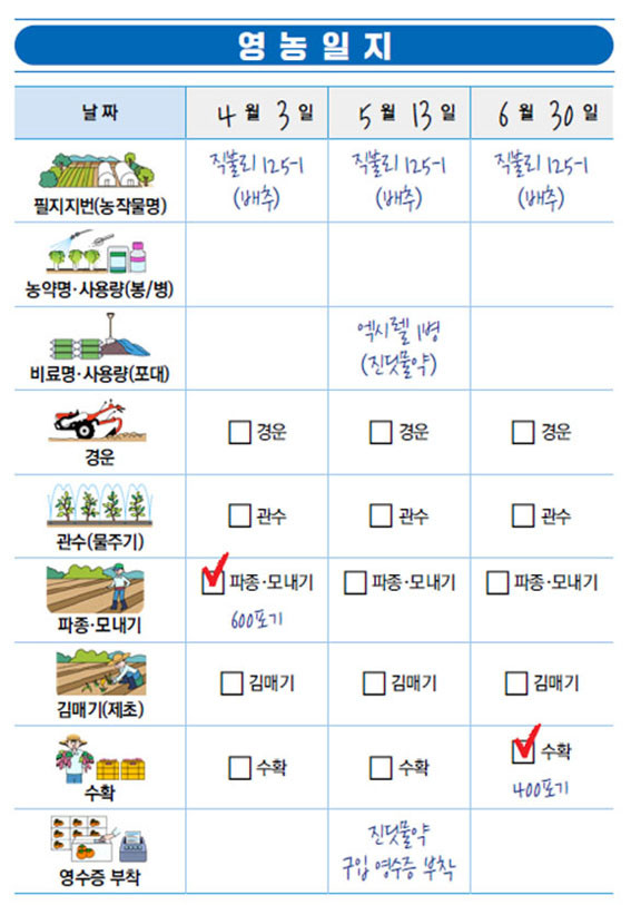 ƯÈ÷ Çʼö¾È³»¼¿¡´Â Á÷Á¢ »ç¿ëÀÌ °¡´ÉÇÑ ¿µ³óÀÏÁö¸¦ Æ÷ÇÔÇϰí Àִµ¥, ±×¸²À» ÀÌ¿ëÇÏ¿© ÇØ´ç ³óÀÛ¾÷À» Ç¥½ÃÇÏ´Â Çü½ÄÀ¸·Î ½±°í °£ÆíÇÏ°Ô ±â·ÏÇÒ ¼ö ÀÖµµ·Ï °³¼±ÇØ °í·É ³ó¾÷ÀÎÀÇ ÆíÀǼºÀ» µµ¸ðÇß´Ù.